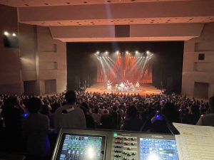 スピーカーチューニングが肝!ということは角松さんもわかっている。そこさえ出来ていれば、あとのバランスはPC内部でとれる。というコンセプトのライブである。PAスピーカーをスタジオモニターにすることがゴールである。角松さんの感じることはほとんど正しくて、それは自分が感じているものとほぼ一致している。それが出来ていない時には当然その部分を指摘される。もしくは、角松さん自身がそこをクリアする術を持っている。そこをやらせないように、そのままでいい状態を作るのが自分の使命である。しかもツアーなので、積み重なっていく。自分の問題でデータが動いてしまうのだ。ともすれば自分で自分の首を締めることにもなる。特に注意するところは、重低音の出方。元音は、大きスピーカーでなければわからないところが出ていたり、出ていなかったりする。言い方を変えれば、デフォルメされる部分が変われば、その印象が変わってしまうのである。それはその時にPCでコントロール出来てしまう。行ったり来たりさせないためにも、正確なチューニングが必要になる。どうしても時間がとられる。しかし、機材は毎回変わり、スタッフも毎回変わる。当然会場も毎回変わる。PAチーフとしての指示も必要になるが、エンジニアとしての部分を優先させざるを得ない。しかも他セクションのスタッフは百戦錬磨のベテラン達。スタッフとしての振る舞いも大切になるし、音がブレたらすぐにバレてしまうスタッフ達である。過去を振り返っても角松さんの現場は、毎回課題が出され、それをクリアしていくことで自分に力がついていくのが感じられ、とてもありがたい。20代の頃からそうだった。具体的にはハウスの低音の処理、モニターも含めたいわゆる「サウンドする」音環境の構築。適切な音量と音質の提供である。ただそれは今までずっと自分が追い求めてきたものと一致しているので、やってきたノウハウでクリア出来る。極端な話、時間さえあれば構築できる。そこを現地機材やスタッフと共にいかに捻出できるがこのツアーで最優先すべきところである。扱い慣れないコンソールもクリアして、その求めるところに向かう。今の所この綱渡りは成立している。崩壊しないように毎回精進してく所存。